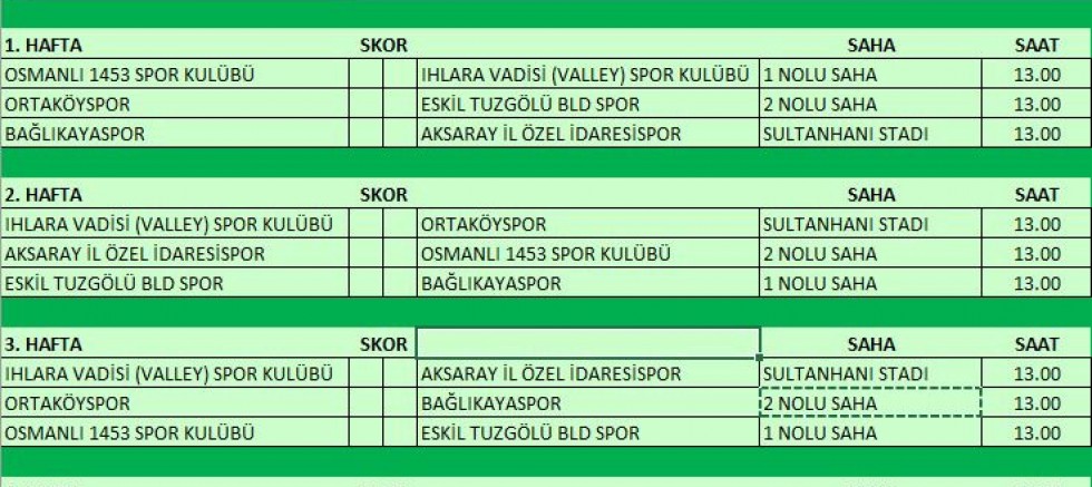 Buna göre ilk hafta müsabakaları şöyle; Osmanlı 1453 FK - Ihlara Vadispor, Ortaköyspor-Eskil Tuzgölü Belediyespor, Bağlıkayaspor-İl Özel İdarespor. Fikstür belli olduktan sonrada ASKF toplu şekilde Mevapark'a iftar yemeğine geçti.